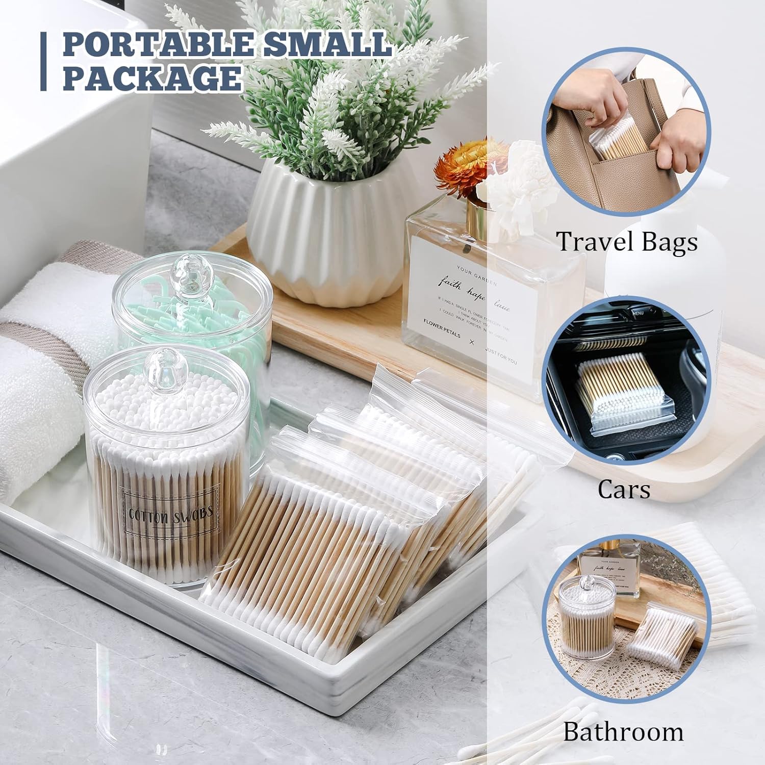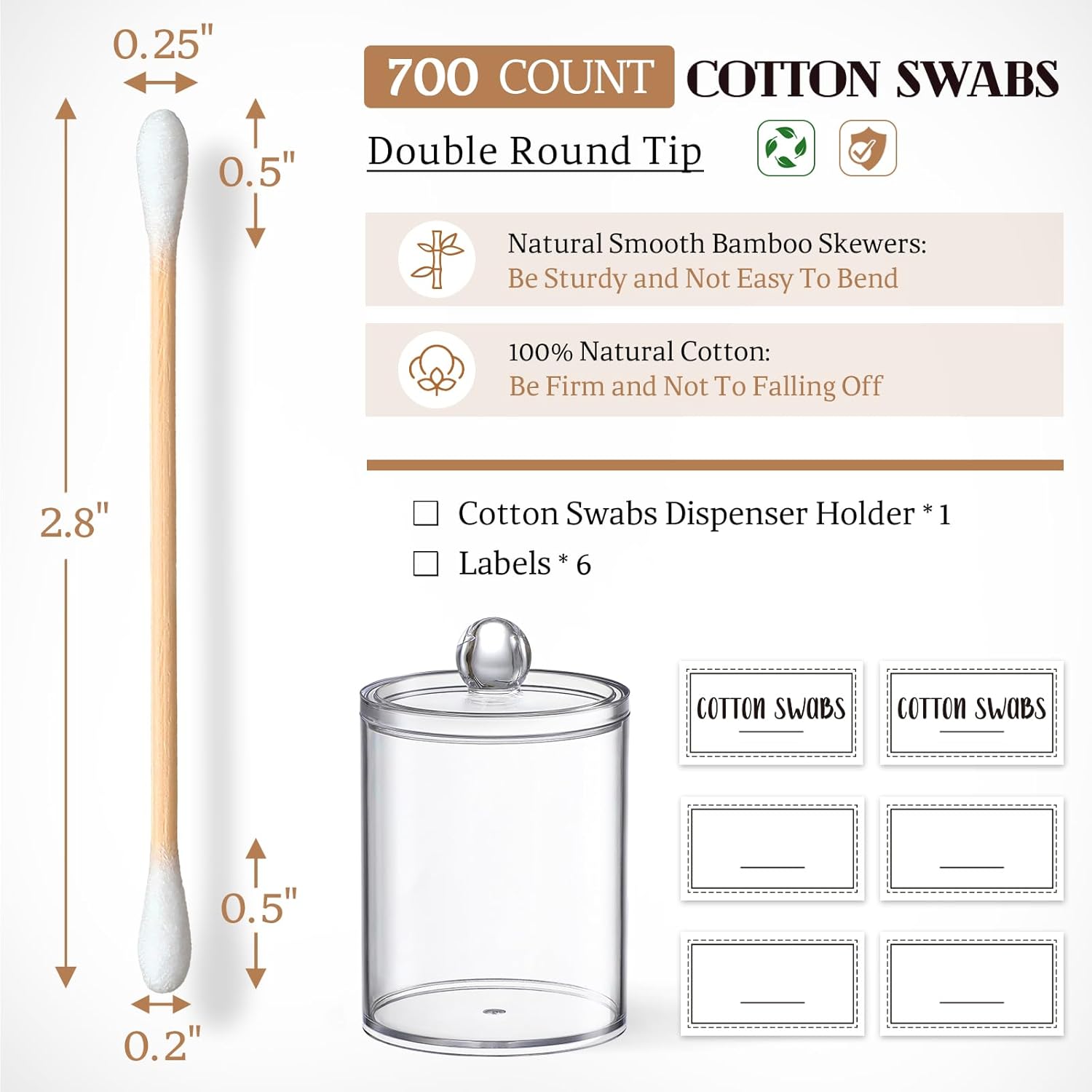 🛒 𝗣𝗿𝗼𝗱𝘂𝗰𝘁 𝗜𝗻𝗰𝗹𝘂𝗱𝗲 – 700 Count double round tips cotton swabs + 1 highly clear 15oz cotton swabs holder + 4 white blank labels + 2 transparent labels pre-printed with black words ”Cotton Swabs”.