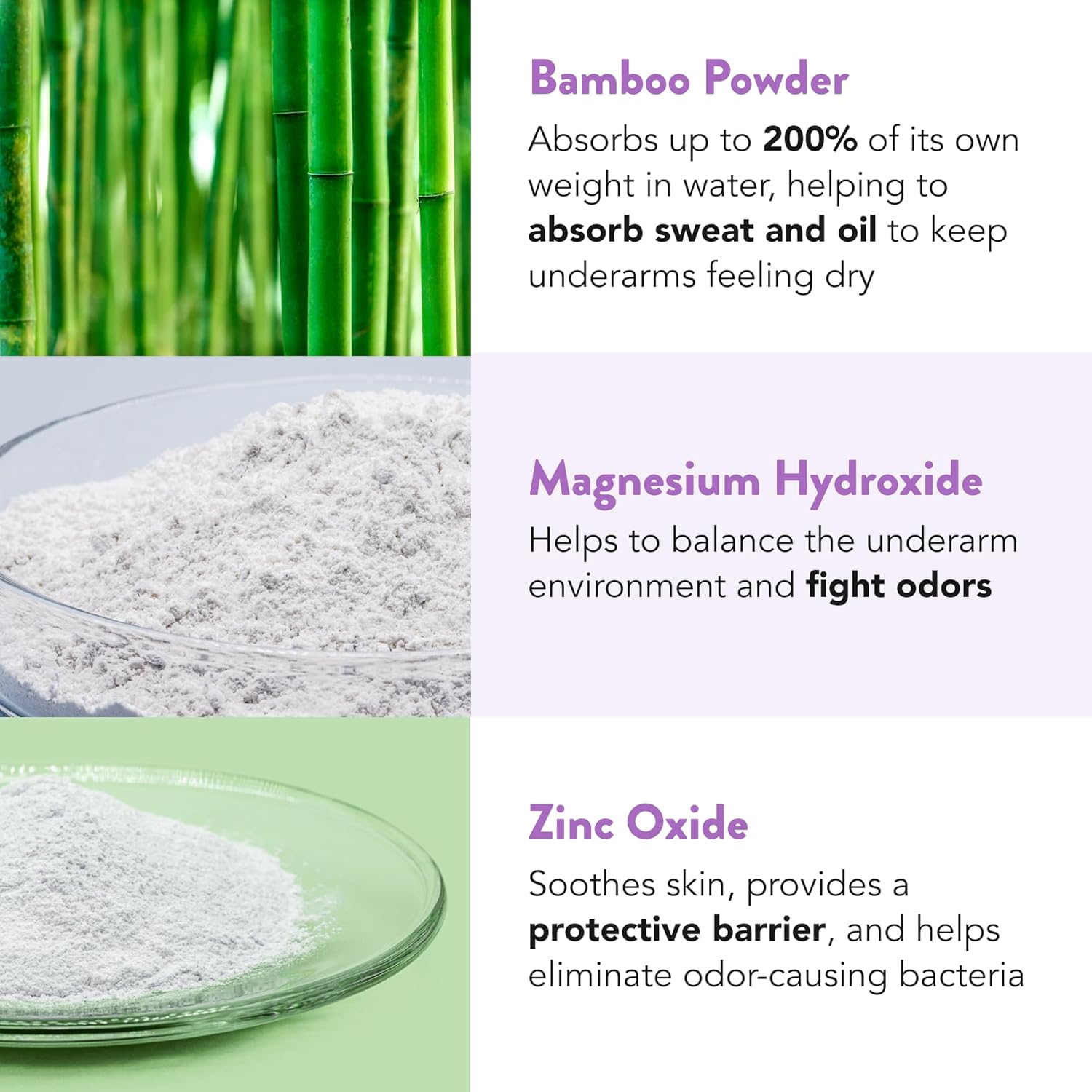 SPECIALLY FORMULATED: Zinc oxide and magnesium hydroxide help prevent odors caused by bacteria. Bamboo powder helps underarms feel dry, while sweet almond oil and jojoba keep underarms silky smooth.