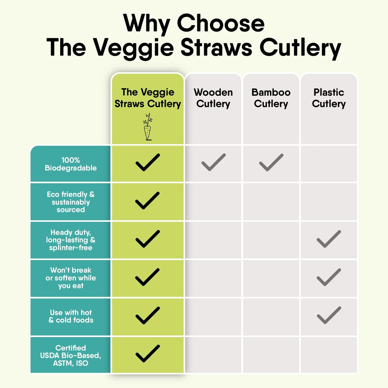 RESPONSIBLY SOURCED – The Veggie Straws disposable spoons, forks and knives are made of cellulose-rich vegetable fibers. They are produced from non-toxic materials that are safe for both you and the environment. We repurpose the waste of vegetable fibers, so nothing goes to waste! These are gluten-free and allergen friendly, so you can use them with peace of mind.