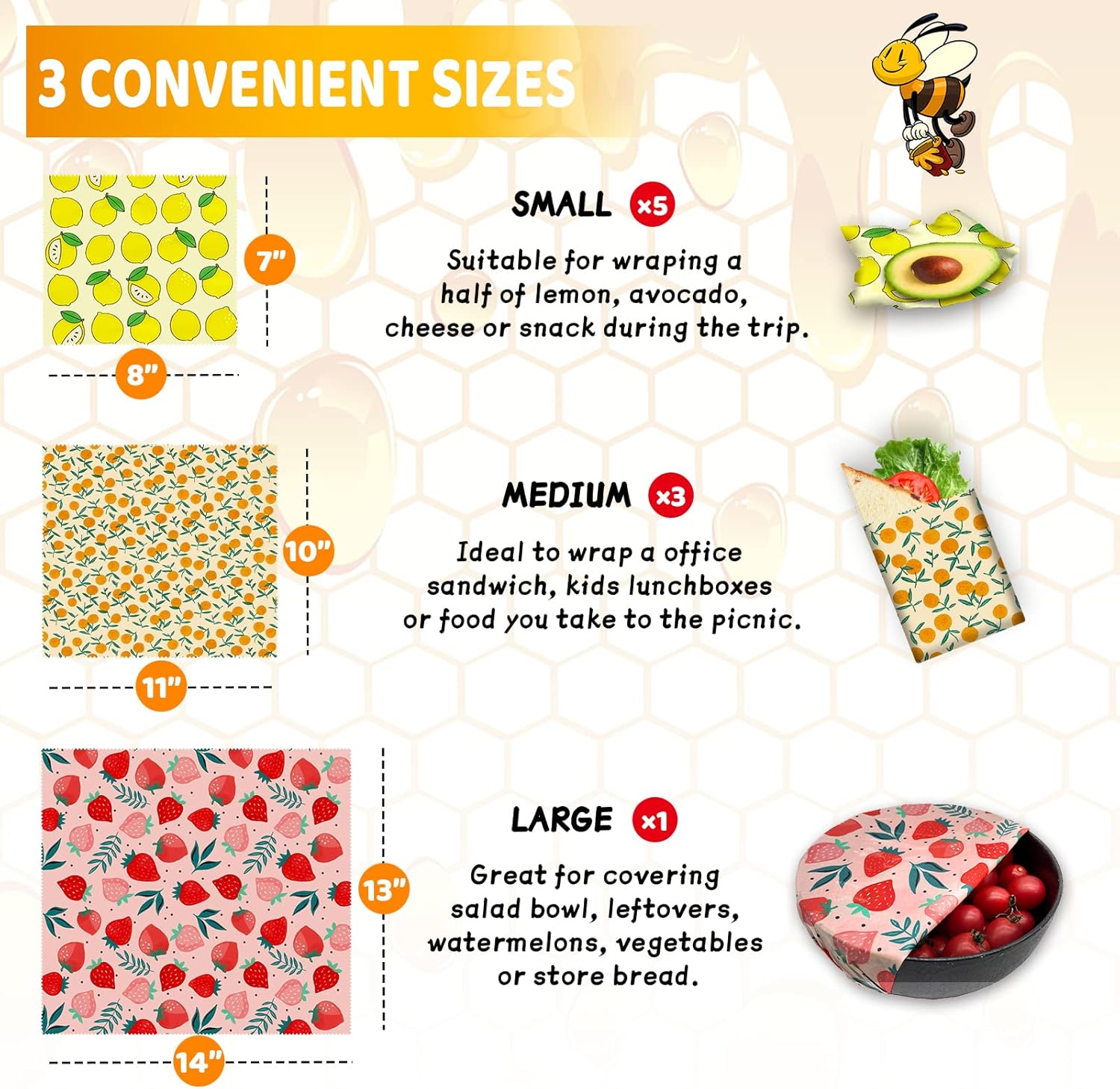 【A Size For Every Occasion】The 9 pack beeswax food wrappers include 5 Small (7″ x 8″) 3 Medium (10″ x 11″), and 1 Large (13″ x 14″) wraps. Reusable food storage wrap organic wax wrap reusable beeswax organic beeswax wraps beeswax plastic wrap beeswax storage wax wraps for food reusable organic reusable sandwich wraps extra large beeswax wrap beeswax bowl covers sandwich wrap reusable wrap reusable food organic beeswax wrap wax covers for food reusable wraps for food beewax wrap.