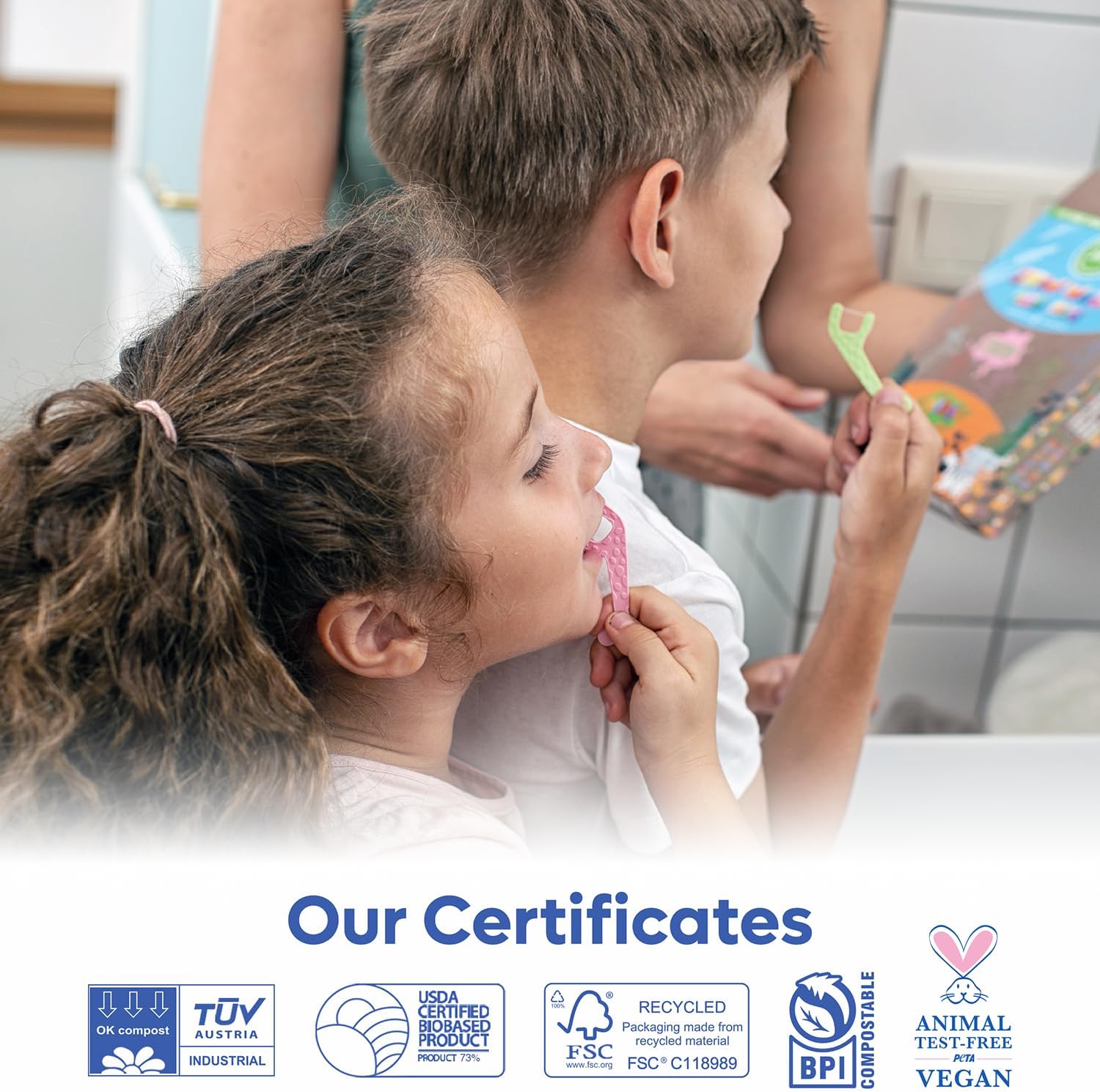 TIGHT GAPS? NO PROBLEM!: These Biodegradable Flossers Have Our Signature Thin Thread For Sensitive Gums & Teeth. Giving Your Child A Soft & Safe Floss, Everytime!
