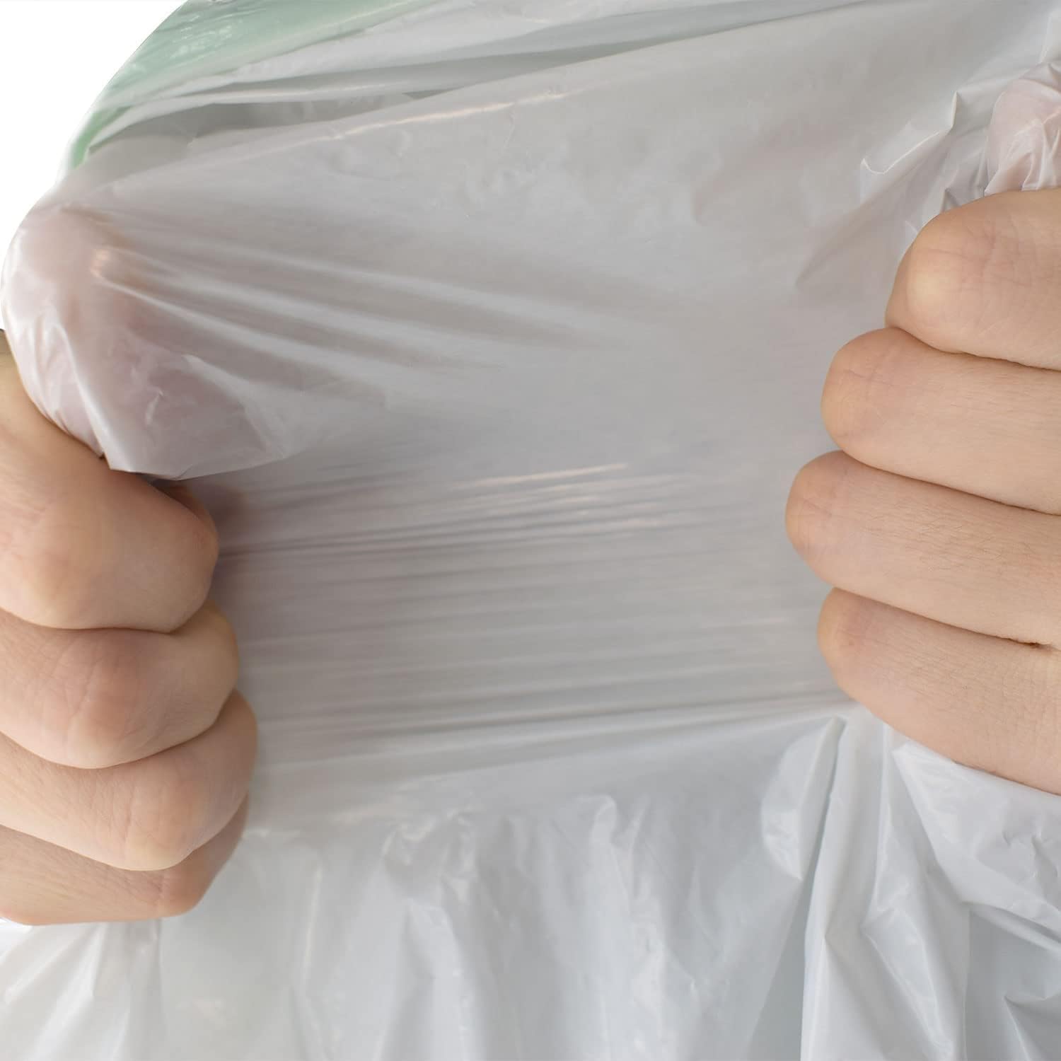 DURABILITY & EASY DISPENSER: White bags with green non-break drawstring closure and durability. 300 bags in a dispenser box. Pull the bag out of the box without tearing.